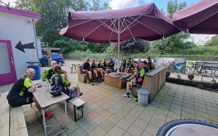 Daarna gingen we in 4 verschillende groepen op weg, met als rustplek het mountainbikemuseum in Schaarsbergen, waar de koffie/thee en appelgebak op ons stonden te wachten. Het parkoers bood ons diverse mooie bekende en onbekende klimmetjes. Op de terugweg richting Amerongen stond er nogal wat wind., maar dat mocht de pret niet drukken. Al met al een geslaagde sponsorrit, met dank aan Vorm in uitvoering.